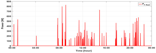 For the obtained energy consumption coefficient per product, a preliminary test was performed, which made it possible to determine the error between the measured value of power PF Real (Figure 10) and the power value PF MOD 0 (Figure 12) estimated from the model.