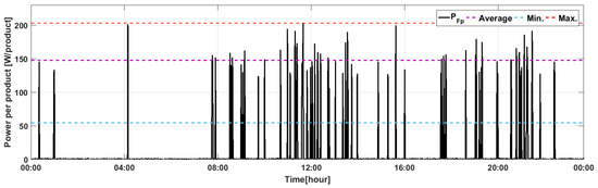 The results of the conducted experiment are presented in Figure 11. The maximum value of energy consumption per product (Figure 11, marked as Max.) amounted to 202.91 W/product, while the minimum value was 54.31 W/product. The obtained average value of energy consumption per product (Figure 11, Average) was equal to 147.47 W/product, and in further research, it will be used as the energy consumption coefficient per product ((9), fpp).