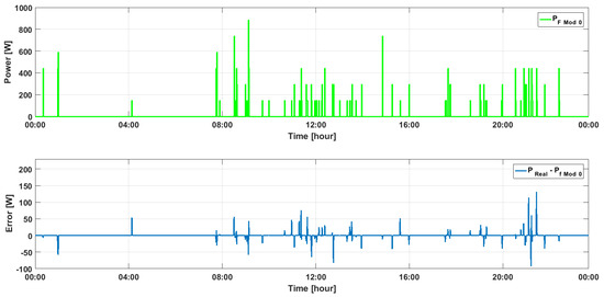 Power calculated by the model for the feeding system PF MOD 0 and the relative error based on the difference between the measured power and power calculated by Mod 0 for a 24 h period.