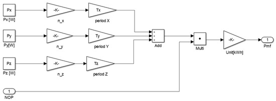 A diagram of the electrical energy consumption model developed in the MATLAB/Simulink environment is presented in Figure 5. The main elements of the developed model are blocks representing a thermostat, a cooling and heating (HAC) unit, and a store container.