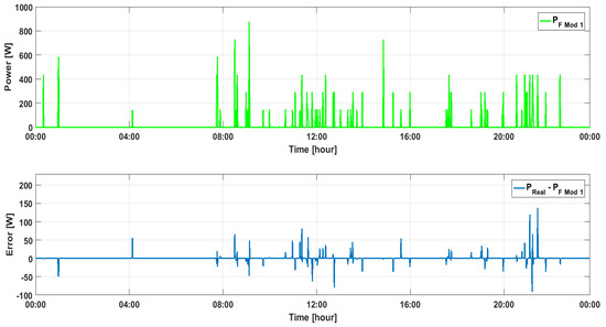 The power PF Mod 1 calculated from the model for the store’s feeding system and the relative error commutated on the basis of the difference between the measured power and power value calculated from the model Mod 1 for the period of 24 h.