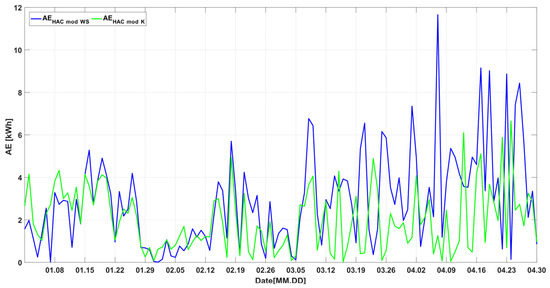 The second stage of the research concerned the tests carried out over the period four months. The carried-out investigation aimed at establishing the influence of the usage of the average daily outdoor temperatures obtained from a meteorological station on the accuracy of the HAC unit model’s calculations. The obtained values of energy consumption (Figure 18) and the calculated absolute error (Figure 19) showed that for the months from January to March, the error deviation values for two considered input datasets were comparable (Table 6 and Table 7). In April, this difference increased significantly. The largest spread of the absolute error (Figure 19) occurred for the 97th measurement day (7 April), in which the average temperature measured was 3.4 °C (max.: 7.6 °C; min.: 0.9 °C), and for the meteorological station, it was 1.9 °C (max.: 3.1 °C; min.: 0.5 °C) (Figure 17). The real temperature during the day remained within the temperature range set by the HAC unit thermostat: 4–7 °C (Figure 17, Th, Tc parameters). This resulted in a relatively low value for the real energy consumption per day of 7.67 kWh (Figure 18). Therefore, the temperature absolute error for that day for the calculations carried out based on the real temperature amounted to 1253 (16.32%), while for the data from the meteorological station, it amounted to 11,655 (151%).