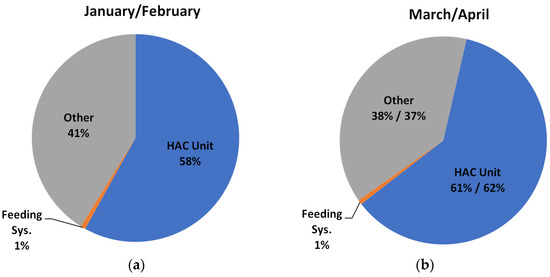 The HAC unit (Figure 20) has the largest contribution to the electrical energy consumption in the analysed time period of four months—approximately 60%. On the other hand, the feeding system, which was switched on when the products are taken, has the smallest contribution of approximately 1%.