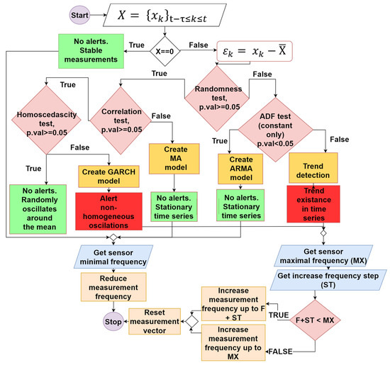 In order to supply data to a decision tree, a signal monitoring algorithm has been built. Based on the readings from the time window, the signal readings are analysed, the behavior of the time series is modeled using statistical tests and, ultimately, “alarm” states are indicated. The algorithm is presented in the next section.