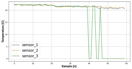 Following previously prepared scenarios, stability tests for individual devices were performed. The results of the conducted research are presented below. The test of the operational stability of the sensor system consisted of a long-term examination of the correctness of the measurements obtained by the sensors involved in the test. The study lasted approximately ten hours and used three temperature sensors, each configured to operate with an identical measurement interval. The measurements’ correctness was checked every ten minutes, resulting in approximately 60 individual tests of the stability of the wireless sensor system.