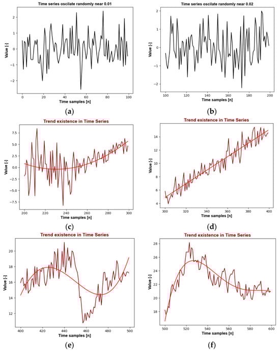 Trend detection with a selected time window in simulated time series; m = 100; (a,b) first two sections without alert; (c,d) middle sections for analyzed signal with the trend; (e,f) last two sections of the time series with detected trend. In the case of non-stationarity, the task is to identify the trend, which is shown by the red line in the graphs.