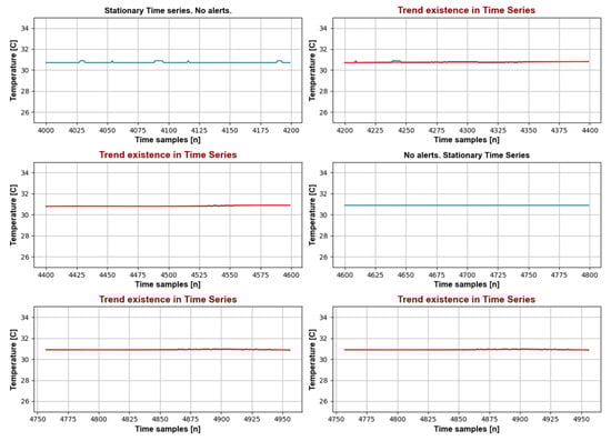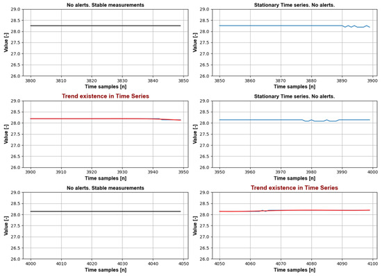 Analysis of real data: time series trend analysis (humidity sensor) for m = 50. From top left: stable measurements; stationary time series; trend existence; stationary time series; no alerts, stable measurements; trend existence.