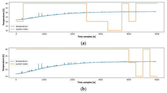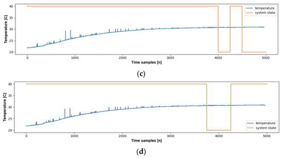 System state changes for different sampling frequencies (temperature sensors; time window m; sampling frequency changes). If a trend or non-homogeneous oscillation is not detected, then the frequency is equal to (a) 1/5 m, (b) 1/4 m, (c) 1/3 m, (d) 1/2 m; otherwise, m = 250.