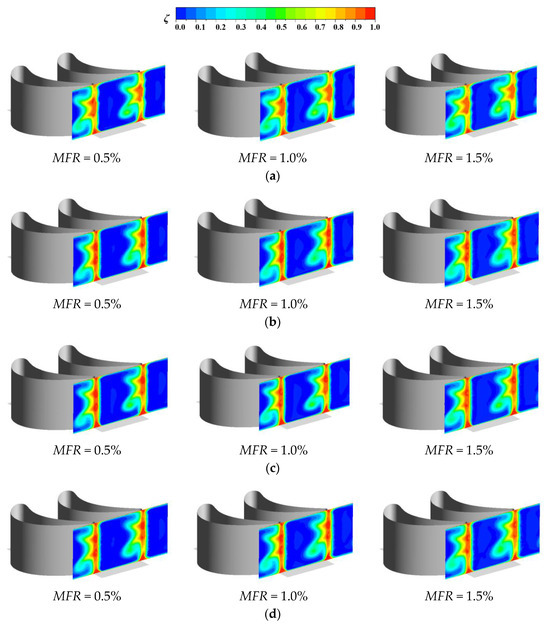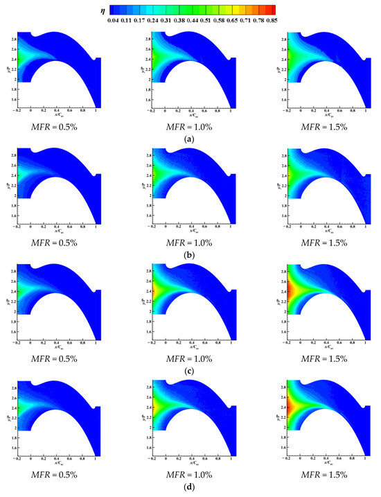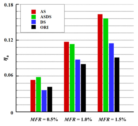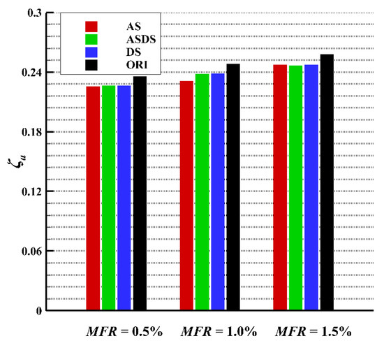 - The cooling effect of the PF was higher when the flow direction of the coolant and mainstream was opposite (both in the cases of AS and ASDS). When the MFR was greater than 1.0%, in the cases with a low MFR, the original structure (ORI) was more effective, and the adjustment to the seal structure had little effect on η on the endwall surface.