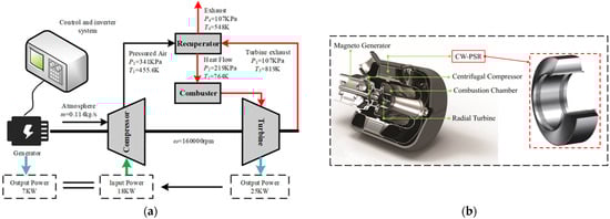A micro gas turbine (MGT) has a high energy density, about 12 kW·h/kg, which can be used as one of the reliable choices of micro mobile power [1,2,3]. However, the thermal efficiency of the MGT using the basic cycle is low, usually less than 20%. By introducing the recuperator, the high-temperature exhaust gas at the turbine outlet can be effectively used to improve the inlet temperature of the combustion chamber, so as to greatly reduce the fuel consumption rate and improve the thermal efficiency to more than 30% on the premise of ensuring compactness and lightweight [4]. Figure 1 shows the thermal cycle diagram of MGT with the regenerative cycle studied in this paper.
