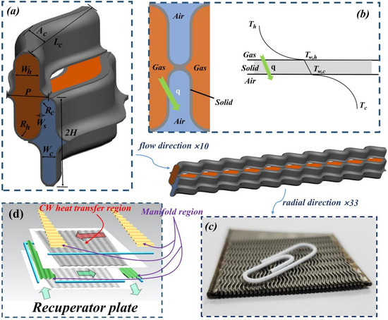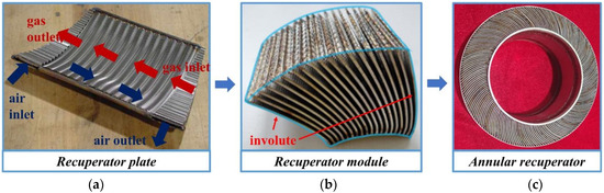 Wang et al. [6] believe that CW-PSR is the best compromise scheme after considering heat transfer and pressure drop characteristics for different types of MGT recuperators. Many scholars have done a lot of work on its thermal and hydraulic performance through numerical simulation. Du et al. [7,8] applied the multi-period boundary condition and the linear decreasing boundary of wall temperature to the numerical simulation of single channels of CW-PSR. By comparing the simulation results of different structural channels, they pointed out the relationship between comprehensive performance and geometric parameters. Ma et al. [9,10] presented a numerical model for heat transfer with anisotropic characteristics, aiming to investigate how the local heat field of the individual channel in CW-PSR is affected by small-scale longitudinal heat conduction. Xi et al. [11] established a three-dimensional fluid–solid coupling heat transfer model considering the interaction of high-temperature hot gas and compressed cold air based on the half wall thickness multi-periodic boundary conditions to predict the flow and heat transfer in a single channel of CW-PSR. The correlation between Re, Prandtl number (Pr), geometric parameters and Nu was established by using the least square method, which provided a basis for the design of CW-PSR. Based on a genetic algorithm, Giugno et al. [12] analyzed the uncertainty of design parameters of plate-fin recuperator and CW-PSR through different probability methods. Cai et al. [13] solved the optimization problem of CW-PSR of MGT with an involute cross-section shape by genetic algorithm and applied the developed method to the optimization design of a CW-PSR of 300 kW power stage MGT. In the MGT, in order to make the CW-PSR surround the rotor system and the outer side of the combustion chamber in an annular shape, it is necessary to bend each CW-PSR plate into a curved shape. Involute is one of the most widely used bending forms at present. After the CW-PSR plate is bent, there will be a great divergence between the heat transfer characteristics calculated by the traditional single channel and the actual heat transfer characteristics of the whole bent plate. Yang et al. [14] demonstrated the above problems in a recent study.