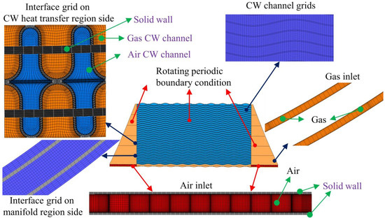 The computational model’s boundary parameters are calibrated to conform with the genuine operational specifications of MGT. Prescribed boundary attributes, including mass flow and overall temperature, are assigned to the inflows on both the air and gas aspects. To be precise, the total temperature at the air inlet is set at 455.6 K, while the gas inlet is adjusted to a temperature of 819 K. The Re is changed by changing the inlet mass flow. Five Re conditions are applied to CW-PSR plates with different bending shapes. The Re on the air side are 315, 480, 645, 810, and 980 respectively, and the corresponding Re on the gas side are 265, 400, 530, 655, and 785 respectively. This has covered the basic operating conditions of CW-PSR applied to MGT [15]. The static pressure boundary conditions are applied to the outlets on both the air and gas sides, and the static pressure is set at 319,000 Pa for the air outlet and 101,325 Pa for the gas outlet. In addition, periodic boundary conditions are also set in the numerical simulation to assume that 171 CW-PSR plates are identical in the circumferential direction in the annular recuperator.