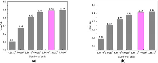 Verification of Grid Independence for CW-PSR Plate. (a) Nu of Air Side; (b) Nu of Gas Side.