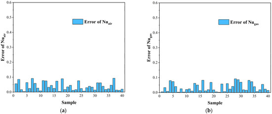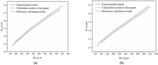 Comparison of Nu between simulation results and test results. (a) Nu of Air Side; (b) Nu of Gas Side. Reprinted from [34], with permission from Elsevier.