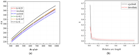 In this paper, six different bending forms of CW-PSR plates are set, which include a non-bending heat transfer plate (k = 0), three circular arc heat transfer plates (k = 0.167, 0.2, 0.25), and two variable curvature form heat transfer plates (involute, cycloid). The CW-PSRs of different bending shapes are obtained by the overall deformation of the same straight plate, without altering the original geometric surface area. Therefore, the CW-PSRs of different bending shapes have the same heat transfer area. The cycloid shape and involute shape have different curvatures at different relative arc lengths, with 0 and 1 representing the inner and outer diameter positions of the CW-PSR, respectively. Figure 7a shows the change of overall thermal conductance (UA) across different bending shapes with Reynolds number. From the results, it can be seen that the UA of the CW-PSR plates with different bending shapes has a similar trend with Re and increases with the increase of Re. In addition, the CW-PSR plate with bending shapes showed a significant decrease in UA, and compared to the arc form, the variable curvature bending shape showed a greater degree of reduction, with the cycloid form being the most severe. Compared to the CW-PSR plate without bending, the UA decreased by a maximum of 8%. As shown in Figure 8b, the CW-PSR plates with involute and cycloidal shapes exhibit significant curvature near the inner diameter.