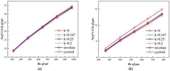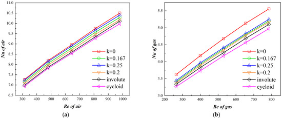 The correlation between Nu (Nusselt number) and Re (Reynolds number) for the air and gas sides is illustrated in Figure 8, where the Nu number increases with the augmentation of the Re. As the Reynolds number increases, the secondary flow becomes more pronounced. Different curved profiles of the CW-PSR exhibit varying Nu values, with the cycloid CW-PSR demonstrating the weakest heat transfer performance on both the air and gas sides. On the gas side, compared to the uncurved CW-PSR, the epitrochoid-shaped CW-PSR experiences a maximum reduction of 8% in Nusselt number, while on the air side, the reduction is 5%.