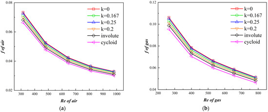 Figure 13a,b present the variations of VFSA and FSA with Re for diverse curved gas channels. According to the established principle of promoting heat transfer with larger VFSA and smaller FSA, their heat transfer capabilities from large to small are k = 0, k = 0.25, k = 0.167, k = 0.2, involute and cycloid, respectively. Upon comparison with Figure 8b, it can be inferred that this outcome is entirely consistent with the gas-side Nu depicted in Figure 8b. Additionally, Figure 8b reveals a significant differentiation in heat transfer capability between the two variants’ CW-PSR plate with k = 0 and cycloid shape, relative to other forms. This phenomenon is solely replicated in VFSA, whereas no marked difference existed between the FSA of cycloid and other examples. The discrepancies between various bending curvatures are more distinct in terms of VFSA than FSA. Within the confines of the study, the maximum variation in VFSA at a given Reynolds number equals 4.575 degrees, while that of FSA is only 0.0114 degrees. These findings indicate that, in the CW-PSR plate, the heat transfer capacity is more responsive to VFSA than to FSA.