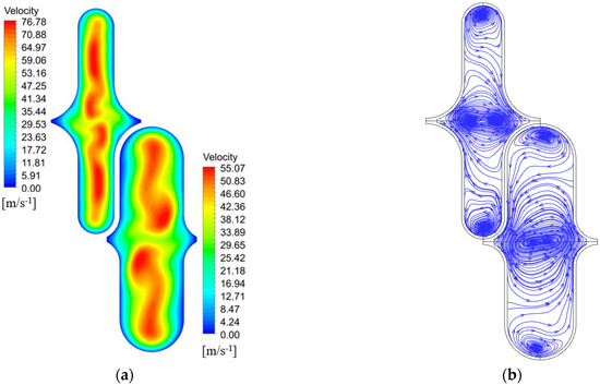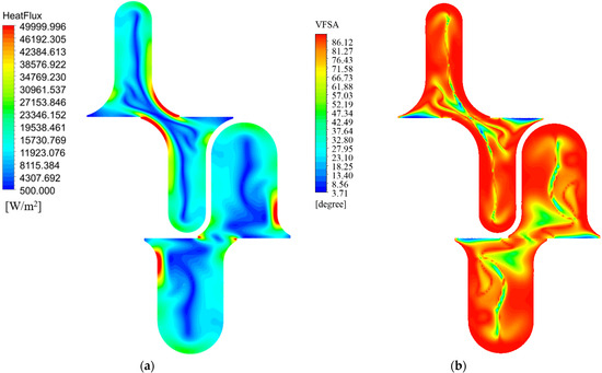 Figure 15 depicts the distribution of FSA and VFSA at the same cross-sectional location. By comparing Figure 8a,b, this divergence in the distribution of FSA and VFSA becomes particularly conspicuous along the boundary of the air channel, where FSA attains larger values. Correspondingly, VFSA also registers substantial values in this region, triggering a rapid decline in the distribution of FSA towards the channel’s central zone. The seeming paradox is reconciled by recognizing the distinct roles these angles play in characterizing heat transfer dynamics. FSA encapsulates the convective term, offering insights into the overall convective heat transfer scenario. In contrast, VFSA delves into the gradient of this convective term, unveiling the nuanced changes in FSA distribution. The intricate interplay unfolds when considering the velocity boundary layer near the wall during convective heat transfer. At this critical juncture, VFSA and FSA both converge towards 90°, indicative of optimal conditions for heat transfer. A larger FSA in this context suggests less favorable heat transfer, while a higher VFSA signals a dynamic shift in FSA distribution, favoring improved heat transfer potential. In essence, VFSA serves as a nuanced indicator, shedding light on the transformative potential within FSA along the channel. Its role extends beyond a direct correlation with heat transfer capability, offering a more profound understanding of the dynamic interrelationships influencing convective heat transfer. This intricate dance between VFSA and FSA, as depicted in Figure 8, highlights the sophisticated nature of heat transfer processes within the channel, guiding us toward a more comprehensive comprehension of the underlying physics at play.