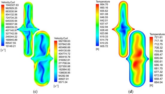Velocity, velocity vector, vorticity, and temperature contours at position Z = Lc. (a) Velocity contours; (b) Velocity vector; (c) Vorticity contours; (d) Temperature contours. Reprinted from [34], with permission from Elsevier.