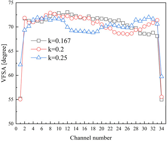When considering CW-PSR plates with a constant curvature arc curve shape, an analysis of Figure 16d–f indicates that a reduction in VFSA values is observed only in portion channels as one moves from the inner diameter position to the outer diameter position. Furthermore, as the degree of curvature increases, the location of these channels progressively shifts toward the inner diameter position. Figure 17 illustrates the distribution of VFSA values for channels at different positions in the CW-PSR plate, where channels closest to the inner diameter are labeled as 1, and the numbering increases sequentially towards the outer diameter, with the channels closest to the outer diameter labeled as 34. The graph reveals that there are several channels with a lower VFSA in the CW-PSR plate, and these channels are closely packed together. Different curved profiles result in a variation in the distribution of these channels, indicating that a curved CW-PSR exhibits noticeable heat transfer non-uniformity. The heat transfer performance of some channels deteriorates, and different curved profiles lead to heat deterioration occurring at different locations.