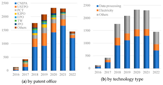 Figure 1a shows the number of energy system patents with blockchain technology categorized by application countries and technology groups and indicates that the number of energy blockchain patent publications has grown greatly from 131 in 2016 to 2299 in 2021. Particularly, energy blockchain technology granted by China National Intellectual Property Administration (CNIPA) increased by 1630 from 2016 to 2021, which occupies almost 75% of the energy blockchain patent rise globally. On the other hand, patents granted by the United States Patent and Trademark Office (USPTO) have the second share in the world and change smoothly compared with that of CNIPA. The reason for the decrease in patents granted in 2022 is considered to be that patents have a time lag of 18 months between application and publication; thus, there are some patents that have not been published yet. Also, the decline in patent publications observed in 2022 can be influenced by various factors beyond the 18-month lag in patent publication such as the outbreak of COVID-19. During the COVID-19 period, many countries worldwide underwent lockdowns, restricting people’s movement and consumption behaviors. This led to reduced profits for numerous businesses and decreased funding allocated for R&D activities. Simultaneously, the uncertainty surrounding future expectations due to the pandemic also diminished corporate investments in R&D efforts, thereby resulting in a decline in the number of patents.