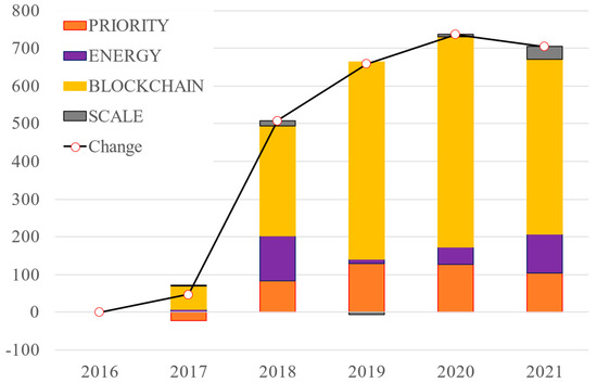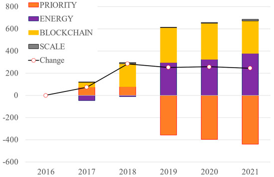 Therefore, changes in the number of patents granted for electricity technologies (∆Electricity) are decomposed by changes in PRORITY (first term), ENERGY (second term), BLOCKCHAIN (third term), and SCALE (fourth term). The term operates as an additive weight for the estimated number of patents granted for data processing technologies. This decomposition methodology was devised by Ang et al., (1998) [17] and is termed the LMDI.