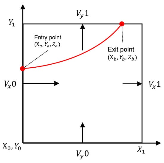 Streamline tracing scheme where a single streamline enters the Y0 face of a single cell and exits the X1 face through the exit point. The curvature along the cell is guided by the calculated in/out flow velocities of all faces of the cell.