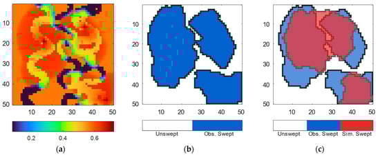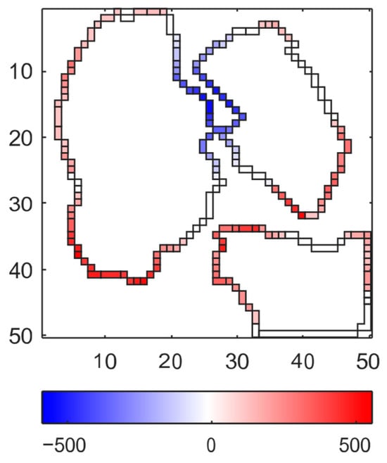 To obtain the waterfronts at a given time (Figure 3b,e), we calculated the difference between the water saturation at (Figure 3a,d) with the initial water saturation at . A threshold was applied to binarize the information into drained/undrained regions, and finally, we extracted the contour of the drained region (a perimeter in 2D and a surface in 3D) (Figure 3c). Since different candidate models have different simulated front shapes (e.g., in 2D having smaller or larger perimeters over a different number of model cells), distances must be computed from the location of the observed front, which should be sourced from seismic 4D interpretation and expertise related to the mechanisms driving the production of a given reservoir. This way, the observed front location, comprising a set of cells to which the distances are to be computed, is input into the algorithm. The final innovation vector is calculated by gathering all the distance measurements obtained from the set of shortest distance paths provided by computed streamlines connecting the observed front to the simulated front. For illustration purposes, Figure 4 is a spatial representation of the obtained innovation vector on top of the observed front location.