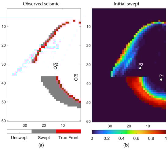 Observed seismic information for the ground truth model (a) and initial ensemble grid block average of swept area (b), where the spread of initial candidate solutions can be observed. Colormap represents block average binarized measured over the initial ensemble (dimensionless).
