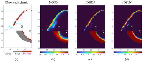 Figure 8 further explores the obtained results by showing the difference (grid block average) obtained between the swept regions of the final ensemble and the ground truth for all three ran experiments. We can again see that not using seismic information renders the final solution far from the truth (Figure 8a), whereas using seismic data provides a much closer match (Figure 8b,c). Moreover, we can see that using the proposed streamlined distance-to-front method provides very similar results when compared to 4DHDF, the advantage of using a substantially reduced amount of data (Figure 9).