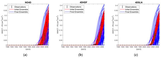 Regarding the production match of the field-producing wells (two producers and one injector), Figure 8 shows the final obtained results in terms of well water cut (WWCT) for producer P2. Well P2 can be taken as a sufficient example as in all cases, the same match quality was observed for all present wells in the model. We can see that in all ran experiments, a reduction of the production ensemble spread was observed. As mentioned previously, and as can be observed in Figure 8, not using seismic data can potentially lead to a final ensemble where production data matching is improved; however, the inclusion of seismic information drastically increases the quality of the final match. In fact, both experiments using seismic data information for the update procedure provided very good matches with similar qualities when coupled with the 4DSLN method, obtaining residually improved results when compared to 4DHDF.