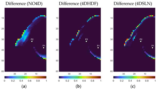 Grid block difference between the obtained swept areas of the final ensemble and the ground truth. NO4D (a), 4DHDF (b), and 4DSLN (c). Units are dimensionless.