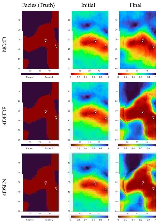 In this section, we resort to a simple 3D channel reservoir to showcase the performance of the proposed method for 4D seismic history matching using streamlines for distance-to-front measurement. The reservoir comprises an anticlinal trap with three facies, containing a North-West to South-East trending leaking normal fault with a throw towards North-East. It has an extension of 5900 × 3800 m with a thickness of 52 m and is discretized into a 60 × 39 × 5 grid with 11,682 active cells in total. The used model attempted to represent the flow of two immiscible phases (oil and water) with a connate water saturation of 0.15, residual oil saturation of 0.15, and initial formation pressure of 400 bar. Out of the three facies in the model, two were permeable, and one acted as a horizontal barrier in the middle layer of the reservoir. The model had two injectors and two producing wells located in the best-quality facies. The true model was randomly sampled from an ensemble of realizations generated through truncated Gaussian simulation (TGS) [,] and conditioned to the information at well locations. The average permeability was 650 mD and 150 mD in the best and background facies, respectively. The average porosity in the best facies was 0.3, and in the background facies, it was 0.18. Field production spanned a total of 20 years, with production occurring through the intervention of two producing wells located on each side of the normal fault and an injector well located in the south.