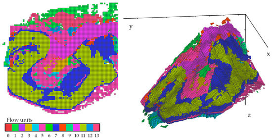 Top view (left) and 3D view (right) of the flow units for the realistic 3D case. Different colors represent different flow units with different rock properties and spatial continuity patterns, 13 in total.