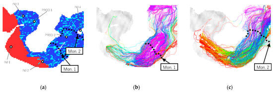 Top view of the initial (blue—0 to red—1) for a realization of the realistic 3D. Well locations (circles with black borders) and two arbitrarily interpreted fronts (dashed black lines) extracted at two different seismic monitoring dates (a). Post-processed fluid flow streamlines (colors represent the time of flight) obtained at the dates of the first and second seismic monitors (b,c).