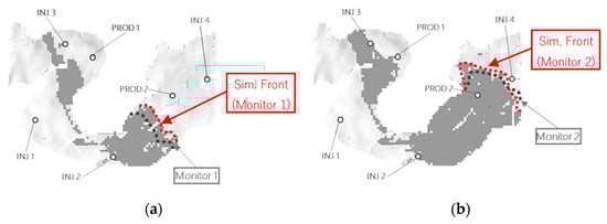 Top view of the front mismatch at monitor date one (a) and two (b). The property shown (dark gray) is the simulated response in terms of binarized along with the associated simulated front (red) obtained for this realization.