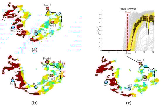 (a) Ground truth along with the associated true front (black) for the first monitor date. (b) Example of simulated of a randomly selected model from the initial ensemble, highlighting an excessive water sweep going over the front (red arrows). (c) Final best-matched model of along with WWCT production curves for PROD4 (c-top). Injectors producers are represented respectively in blue and red circles.