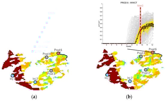 (a) Ground truth along with the associated true front (black) for the second monitor date. (b) Final best-matched model of along with WWCT production curves for PROD6 (b-top). Injectors producers are represented respectively in blue and red circles.