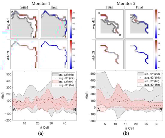 Summary of the front matches for a given layer of the model at the first (a) and second (b) monitor dates with the grid block mean and standard deviations of distance-to-front obtained in the initial and final ensembles (top). A plot of the most representative initial and final waterfront locations in regard to the mean distances measured over the ensemble is represented in gray shade. In the bottom, the initial and final grid block average (red and black dots) and standard deviation (red and grey area) of distance-to-front obtained for all layers of the model where a front was interpreted.