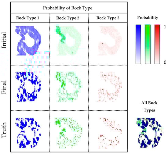 Summary of the probability of rock type obtained from the run experiment. The initial (top) and final (middle) matches of facies type (blue, green, red) match are compared against the ground truth (bottom).