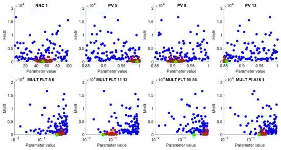 Scatter plot of the parameter value (x-axis) vs. misfit (y-axis) for the convergence of a selected set of parameters (true value in green circle) from the initial (blue) to the final iteration (red).