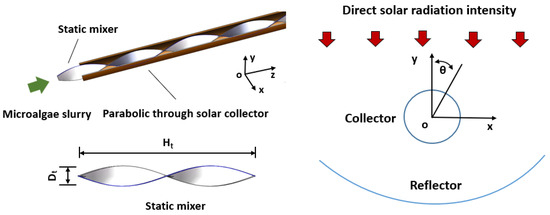 Twisted tape is an efficient device that is inserted in tubular reactors for the enhancement of the heat transfer of fluid [26,27]. Regarding biomass slurry as a heat transfer fluid, high viscosity limits its heat transfer enhancement. Twisted tape inserted in the heat transfer can give rise to the swirl effect and reduce the thermal boundary layer thickness of heat transfer fluid in the tube [28,29], enhancing the convective heat transfer performance. Moreover, algal slurry is a non-Newtonian fluid, causing the appearance of shear-thinning properties [30]. Therefore, the swirl effect of algal slurry is able to reduce the viscosity, further enhancing the heat transfer of algal slurry [27]. Recently, static mixers are increasingly being utilized in heat transfer process industries [31]. The Nusselt numbers of tubes with static mixers are three times higher than plain tubes, while the twist ratio of the static mixer is between 3 and 10 [32]. In addition, the high-efficiency mixing induced by static mixers is beneficial to optimize the mass transfer in the continuous reactor during chemical conversion [33,34]. Chen et al. proposed a tubular reactor with a static mixer [24]; the convective heat transfer coefficient (1707 W⋅m−2⋅K−1) and biocrude yield (0.298 g⋅L−1) were 2.55 and 1.59 times higher than those of a plain tubular reactor [22]. In general, the heat transfer performance of fluid in the tube flow with static mixers has been discussed in detail. However, the HTL of biomass slurry in tubular reactors with non-uniform heat resources has not been clearly investigated. Therefore, the heat transfer enhancement of algal slurry in solar-driven HTL reactors with static mixers deserves to be investigated.