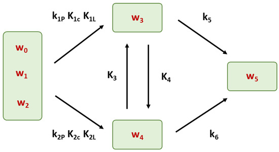 where k0–k6 are reaction rate constants (s−1) [16]: