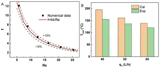 The reliability of the numerical results of flow resistance, heat transfer and HTL conversion were compared to experiment data. The flow resistance of microalgae in cold conditions obeys the Darcy friction factor [39,40]. The difference between the numerical data and theoretical value was under 10% (Figure 4A). The outlet temperature of algal slurry obtained by experimental data and numerical data was compared to validate the heat transfer. The calculated outlet temperatures of algal slurry in a plain solar-driven reactor were compared with experimental data at 40, 50 and 60 L/h [17], whose errors were 26%, 17.7% and 15%, respectively (Figure 4B). In addition, the reliability of the numerical procedure for simulating the HTL of algal biomass in a continuous reactor has been validated in a previous investigation [24]. The outlet concentration of biocrude obtained by experimental data and numerical data was compared to validate the products from the hydrothermal process.