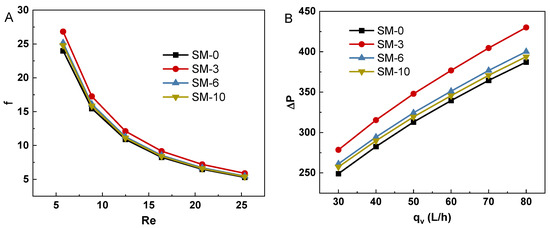 Figure 5A shows the friction factor of the algal slurry flow through the solar-driven reactor with various static mixers, whose twist ratio of the static swirls ranged from 0 to 10. The friction factor of the microalgae flow through the solar-driven reactor significantly decreased with the increasing Re from 5 to 25. At a certain Re, the friction factor of SM-3 was slightly higher than that of SM-6, SM-10 and SM-0. This phenomenon revealed that the friction-loss-inducing static mixer inserted in the solar-driven reactor was acceptable.