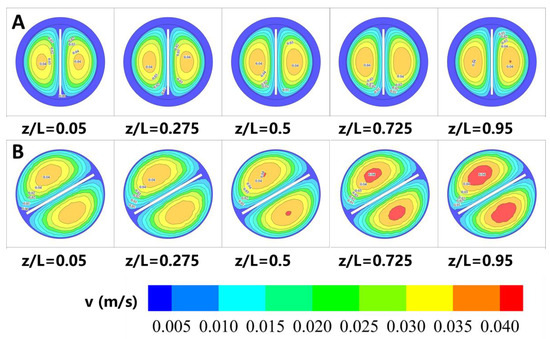 (A) Average velocity distribution of the algal slurry in (A) SM-0 and (B) SM-3 at 60 L/h.