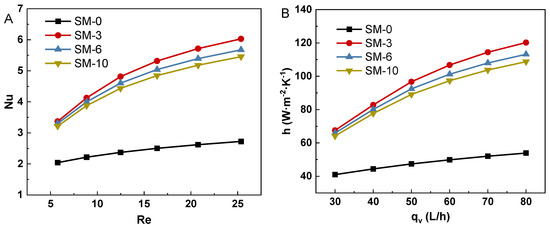 Figure 7B shows the h increased with the increasing Re from 5 to 25. At a certain flow rate, the h of the solar-driven reactor with a static mixer was significantly higher than that of the solar-driven reactor without a static mixer. For example, the h of the algal slurry in SM-3 (97 W·m−2·K−1) was 2.06 times that of SM-0 (47 W·m−2·K−1) at the flow rate of 50 L/h. It indicated that the swirling effect induced by the static mixer obviously enhanced the heat transfer performance of the algal slurry in the solar-driven reactor, while the swirling effect was enhanced by the increased of flow rate. In addition, the maximum h was observed in the solar-driven reactor with SM-3. For example, the h in SM-3 (120 W·m−2·K−1) was 1.06 and 1.10 times that of SM-6 and SM-10 at 80 L/h, respectively.
