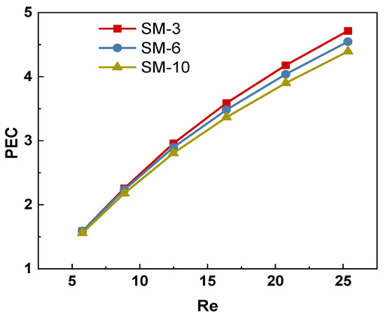 Figure 7A shows that the Nu of the algal slurry increased with the increase in Re from 5 to 25. Particularly, the growth slope of Nu in the solar-driven reactor with a static mixer was obviously higher than that of the solar-driven reactor without a static mixer. For instance, the Nu increased from 2.04 to 2.72 with the Re from 5 to 25 in SM-0, while the Nu increased from 3.37 to 6.03 with the Re from 5 to 25 in SM-3. It indicated that the swirl effect induced by the static mixer was enhanced by the increasing flow rate. In addition, the Nu of the algal slurry in the solar-driven reactor decreased with the increasing twist ratio of the static mixer at a certain Re. For example, the Nu of SM-3, SM-6 and SM-10 were 6.03, 5.67 and 5.45 at the Re of 25, respectively.