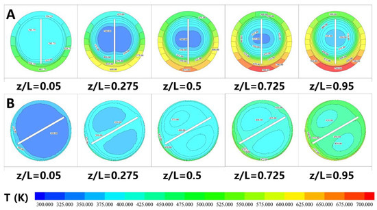 Temperature distribution of the flow cross-section in (A) SM-0 and (B) SM-3 at 60 L/h.