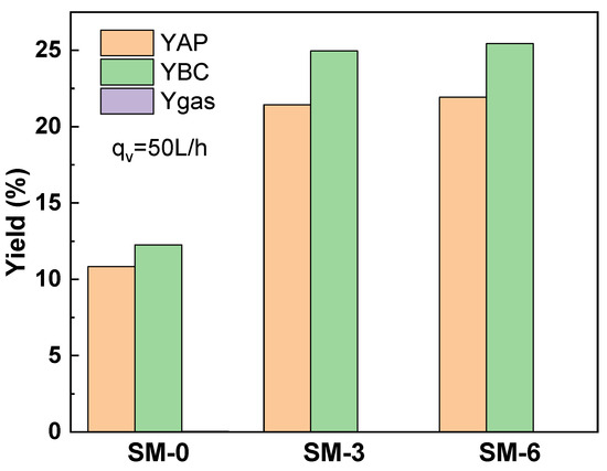 The static mixer installed in the solar-driven reactor not only promotes the heat transfer of algal slurry but also promotes the production of HTL products. Figure 10 shows the yield of water-soluble organics, biocrude and biogas by the solar-driven reactor in SM-0, SM-3 and SM-6, respectively. Compared to the yield of aqueous organics (21.4%) and biocrude (25.0%), the biogas yield (7.81 × 10−4%) was negligible.